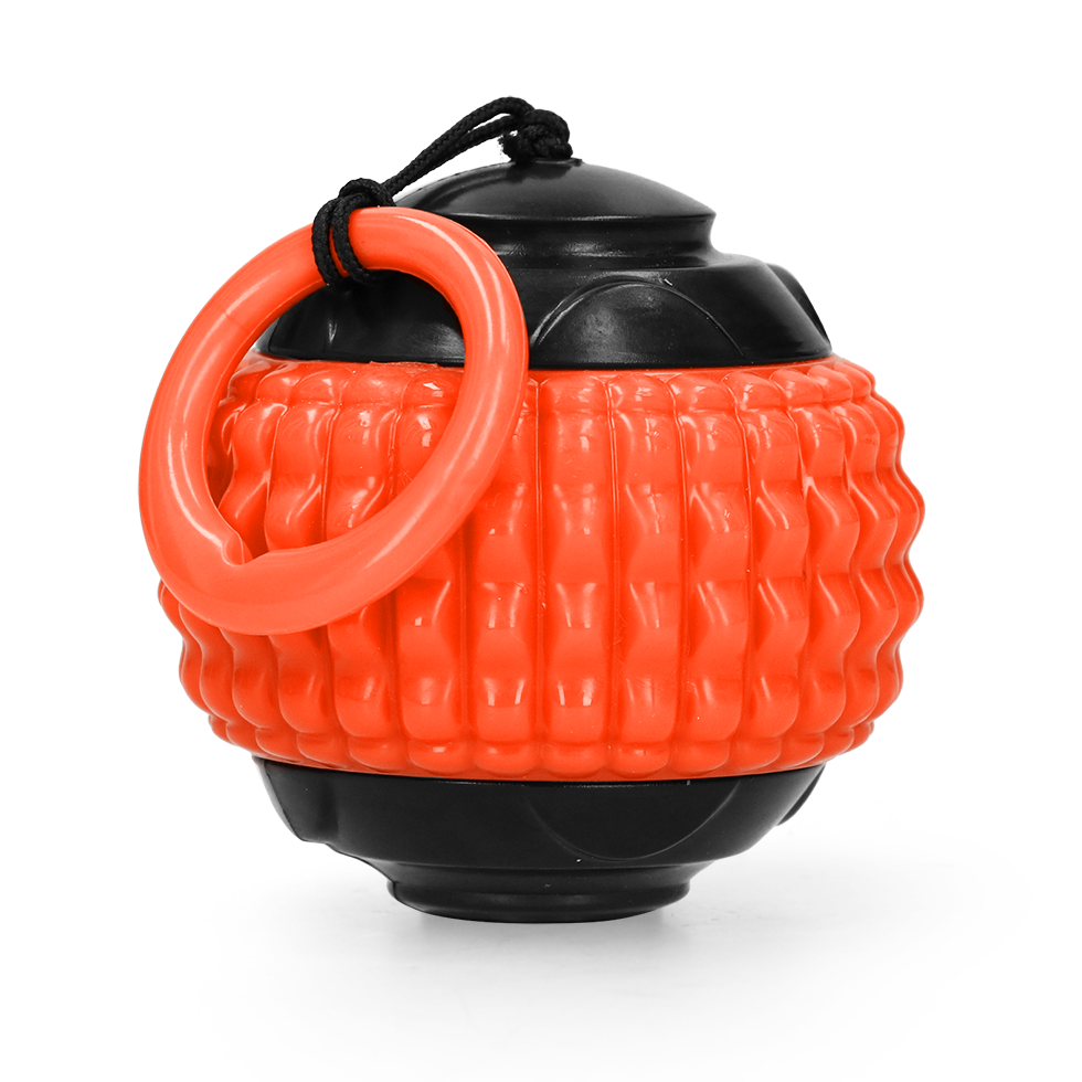 Pak de ring aan het touwtje, draai rond en gooi de bal ver weg. Het touwtje rolt vanzelf op in de bal. De ribbels in het rubber masseren het tandvlees en helpen het gebit te reinigen.