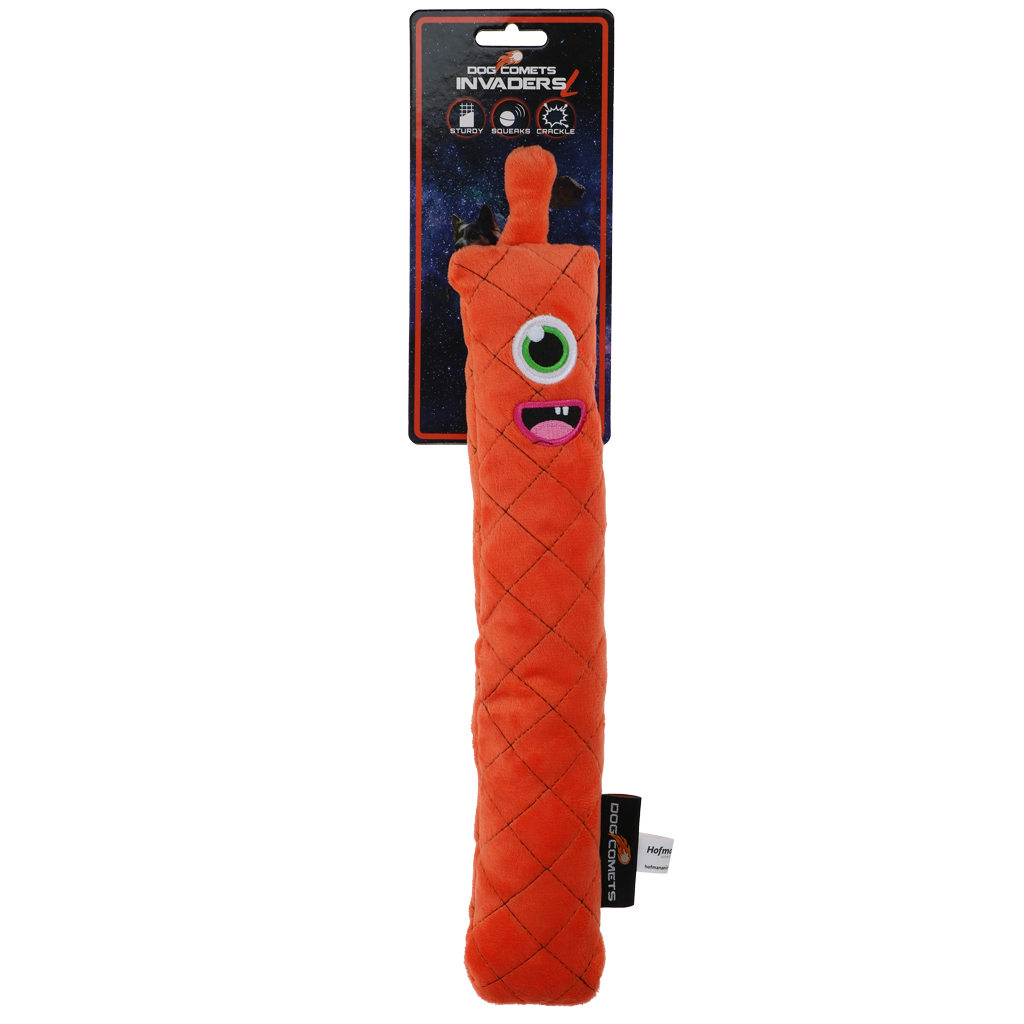 Deze buitenaardse wezens nemen samen met de trouwste viervoeters de wereld over! Deze knuffelige werpstokken zijn gevuld met een sponsvulling, wat ze zwaarder en dichter maakt dan standaard hondenspeeltjes. Het knisperende materiaal aan de binnenzijde en de pieper zorgen voor extra stimulans tijdens het spelen en moedigen de hond aan om zijn tanden in het speeltje te zetten. De Invaders zijn perfect om binnen mee te spelen, lekker mee te knuffelen en trek- en apporteerspelletjes te doen. Elke Invader heeft een unieke gezichtsuitdrukking en persoonlijkheid.