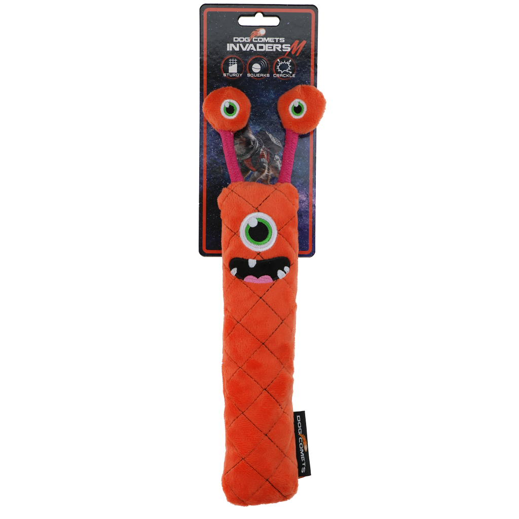 Deze buitenaardse wezens nemen samen met de trouwste viervoeters de wereld over! Deze knuffelige werpstokken zijn gevuld met een sponsvulling, wat ze zwaarder en dichter maakt dan standaard hondenspeeltjes. Het knisperende materiaal aan de binnenzijde en de pieper zorgen voor extra stimulans tijdens het spelen en moedigen de hond aan om zijn tanden in het speeltje te zetten. De Invaders zijn perfect om binnen mee te spelen, lekker mee te knuffelen en trek- en apporteerspelletjes te doen. Elke Invader heeft een unieke gezichtsuitdrukking en persoonlijkheid.
