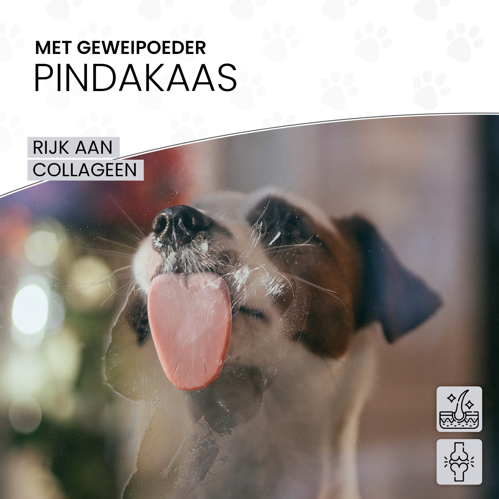 Deze unieke lekkernij combineert de onweerstaanbare smaak van pindakaas met de voordelen van geweipoeder voor een gezonde traktatie waar je hond dol op zal zijn.
