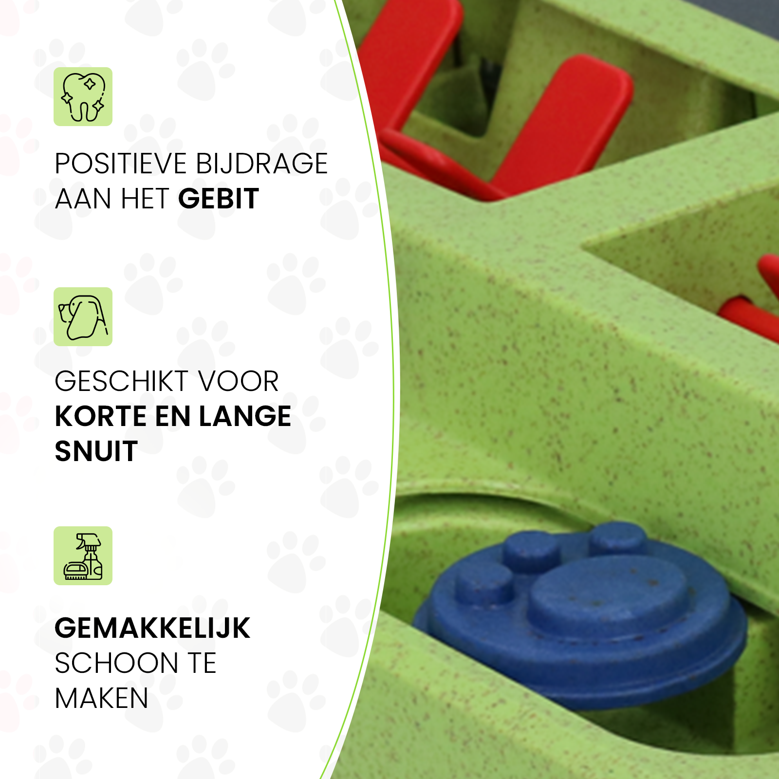 De Eat Slow Live Longer Puzzle is een leuke manier om honden bezig te houden en tegelijkertijd te belonen. Door brokjes of snacks in de puzzel te verstoppen, zal de hond zijn best moeten doen om alle lekkernijen te vinden door onderdelen te verschuiven, te draaien en te openen. Dit zorgt voor mentale en fysieke uitdaging en het kan bijdragen aan het verminderen van verveling, angst en destructief gedrag. Daarnaast kan het de band tussen baasje en hond versterken wanneer ze samen met de puzzel bezig zijn. De voerpuzzel kan ook ingezet worden als anti-schrok voerbak. De puzzel is voorzien van anti-slip voetjes en is vaatwasserbestendig.