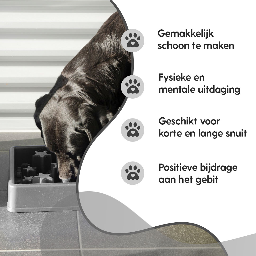 Gebruik de anti-schrokbak voor de dagelijkse portie(s) droogvoer. Verdeel het droogvoer gelijkmatig over de voerbak. Deze voerbak kan ook gebruikt worden bij het geven van snacks, zodat de hond of kat moeite moet doen om het lekkers te pakken te krijgen.