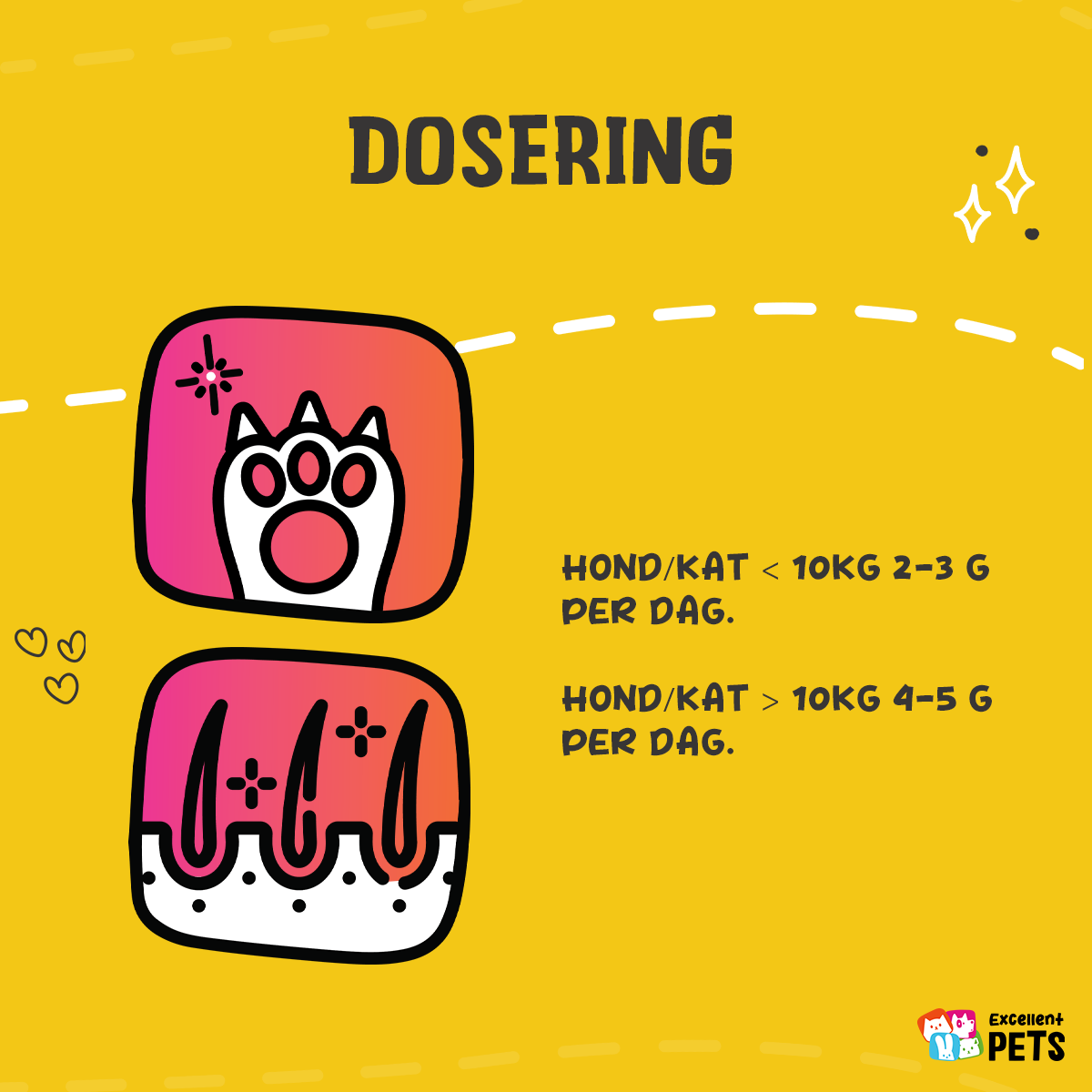• Voor honden van 10 kg of zwaarder: 4 tot 5 g per dag