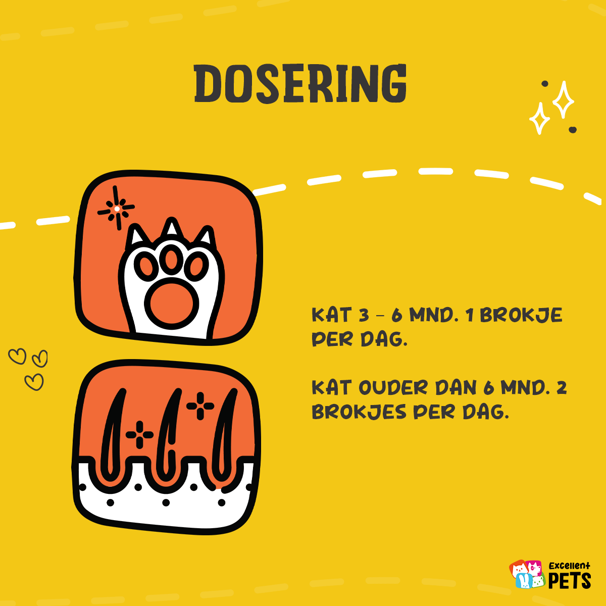 - Voor katten ouder dan 6 maanden: 2 brokjes per dag