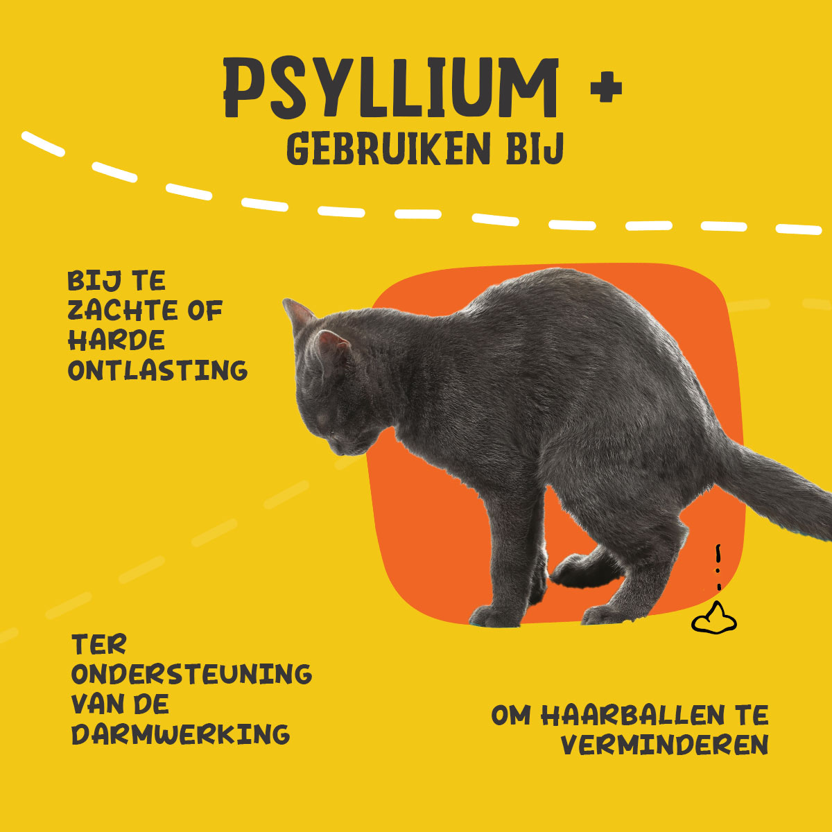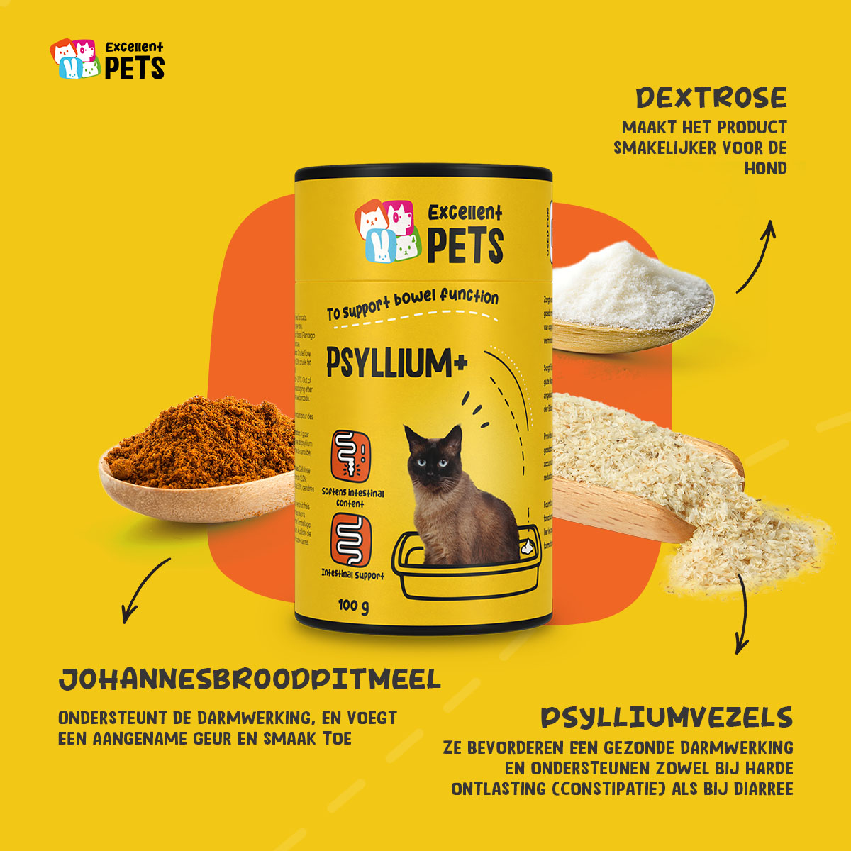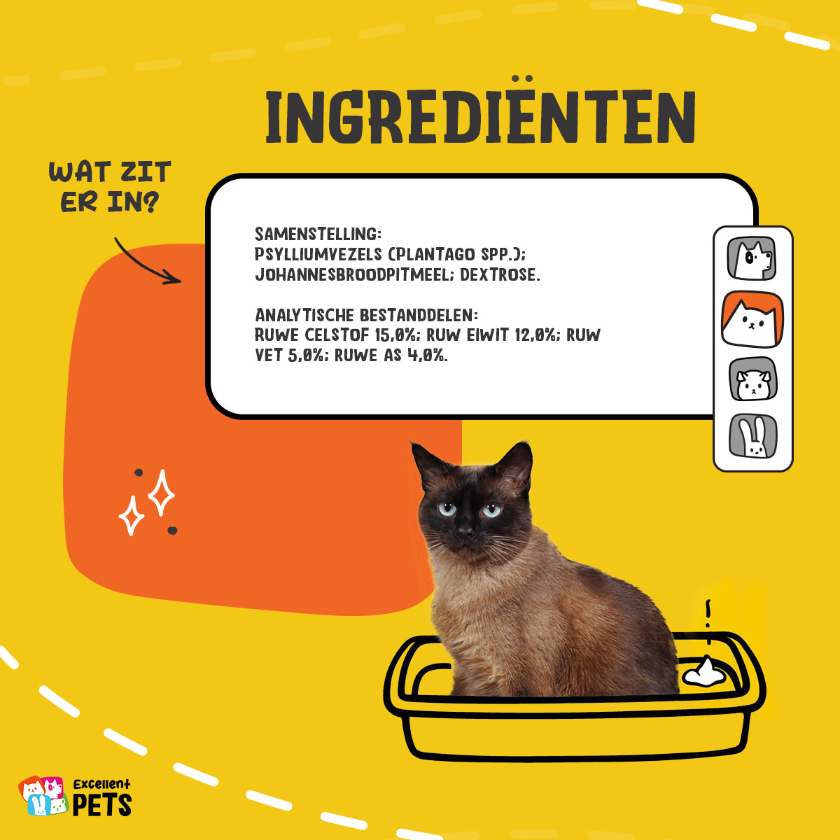 Excellent Pets Cat Psyllium+ bevat onder andere psylliumvezels en johannesbroodpitmeel. Psylliumvezels zijn de zaadschillen van vlozaad, dat afkomstig is van een plant uit de weegbreefamilie. Het helpt de ontlasting zachter te maken en draagt bij aan een goede darmwerking. Johannesbroodpitmeel ondersteunt eveneens de darmwerking en geeft het product een aangename smaak en geur. Psylliumvezels dragen ook bij aan het binden van opgehoopt haar aan de ontlasting, om haarballen te verminderen.