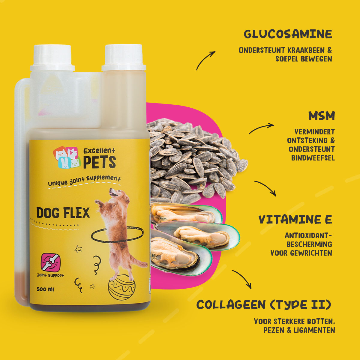 Excellent Pets Dog Flex bevat onder andere glucosamine, MSM, gehydrolyseerd collageen (type II), hyaluronzuur en vitamine E. Glucosamine komt van nature voor in de gewrichten, pezen en het kraakbeen. Het draagt bij aan de smering en behoud van soepelheid van de gewrichten. MSM (methylsulfonylmethaan) is een bron van zwavel en ondersteunt de gewrichten. Collageen is een bouwsteen voor het lichaam en heeft een gunstig en snel effect op het kraakbeen, de botten en de spieren. Hyaluronzuur is een lichaamseigen smeerstof die in de gewrichtsvloeistof voorkomt. Het ondersteunt de gewrichtsfunctie en het behoud van soepele gewrichten. Vitamine E is een natuurlijke antioxidant die het lichaam helpt te beschermen.