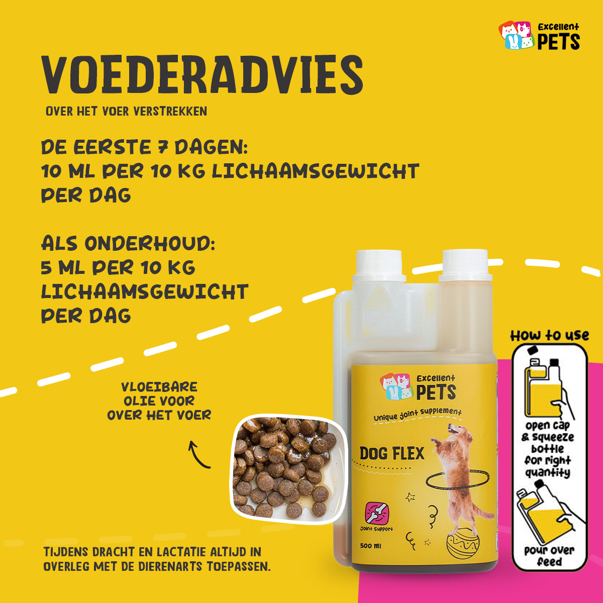 Excellent Pets Dog Flex is een aanvullend diervoeder voor honden in vloeibare vorm. Het draagt bij aan soepele gewrichten en aan stevige botten, pezen en banden.