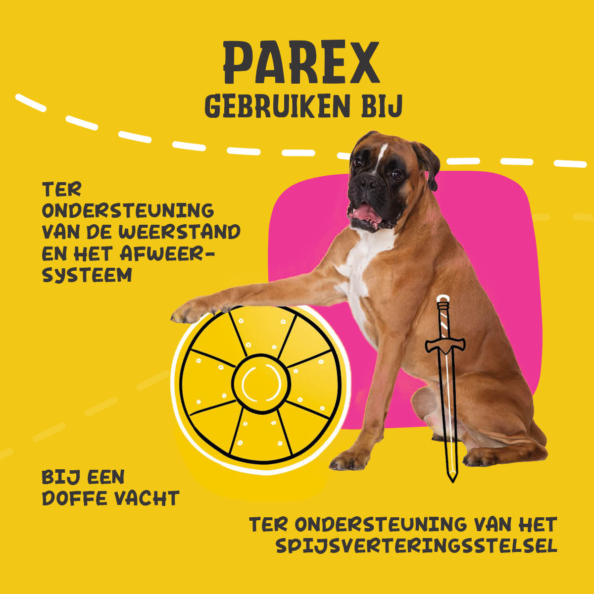 Excellent Pets Dog Parex is een aanvullend diervoeder voor honden in brokvorm. Het activeert het afweersysteem en draagt bij tot een gezonde en evenwichtige maag- en darmflora.