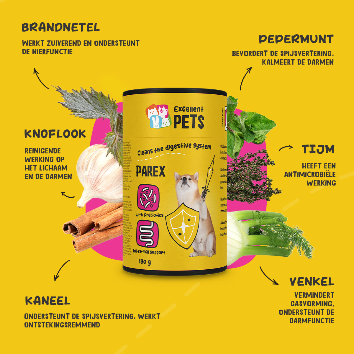 Excellent Pets Dog Parex bevat onder andere een kruidenmengsel, dat bestaat uit Ceylonkaneel, knoflook, gewone tijm, pepermunt, venkel, kleefkruid, grote brandnetel, gladde iep, bitterhout en chilipoeder. Dit mengsel helpt het spijsverteringsstelsel te reinigen, activeert het afweersysteem en draagt bij aan een glanzende vacht. Daarnaast bevat het prebiotica in de vorm van FOS en MOS. FOS (fructo-oligosachariden) en MOS (mannan-oligosachariden) zijn prebiotische vezels, die bijdragen aan de groei van goede darmbacteriën, dat gunstig is voor het behoud van een gezonde spijsvertering. Pluimveevet en zalmolie zorgen voor een lekkere smaak.