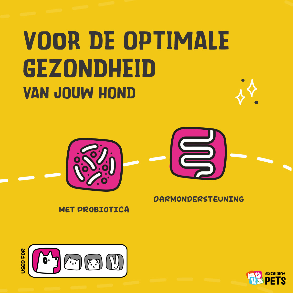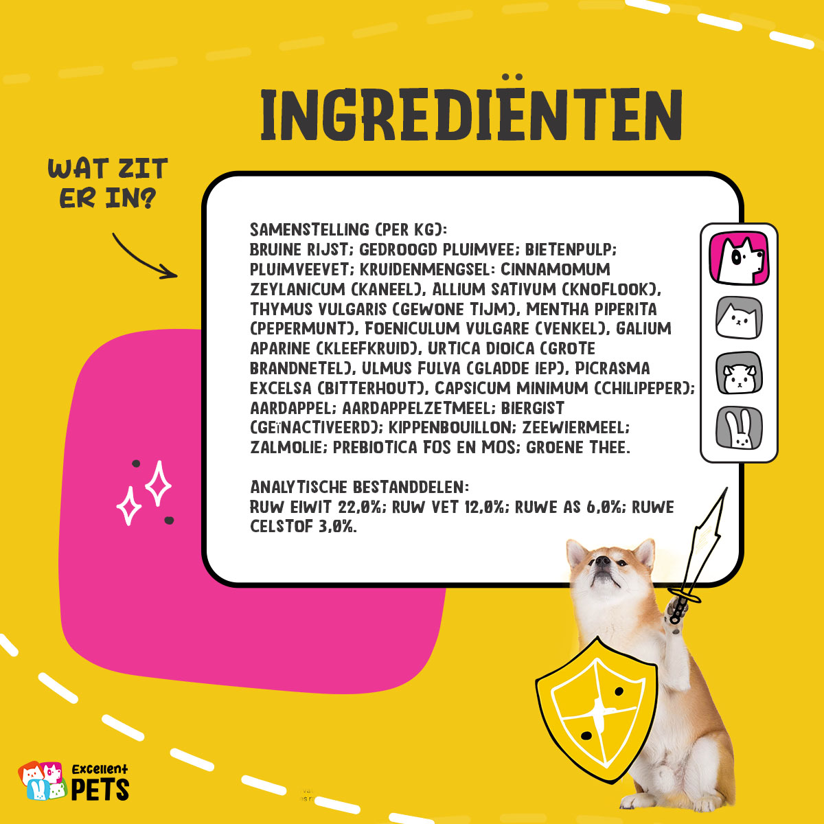 Excellent Pets Dog Parex bevat onder andere een kruidenmengsel, dat bestaat uit Ceylonkaneel, knoflook, gewone tijm, pepermunt, venkel, kleefkruid, grote brandnetel, gladde iep, bitterhout en chilipoeder. Dit mengsel helpt het spijsverteringsstelsel te reinigen, activeert het afweersysteem en draagt bij aan een glanzende vacht. Daarnaast bevat het prebiotica in de vorm van FOS en MOS. FOS (fructo-oligosachariden) en MOS (mannan-oligosachariden) zijn prebiotische vezels, die bijdragen aan de groei van goede darmbacteriën, dat gunstig is voor het behoud van een gezonde spijsvertering. Pluimveevet en zalmolie zorgen voor een lekkere smaak.