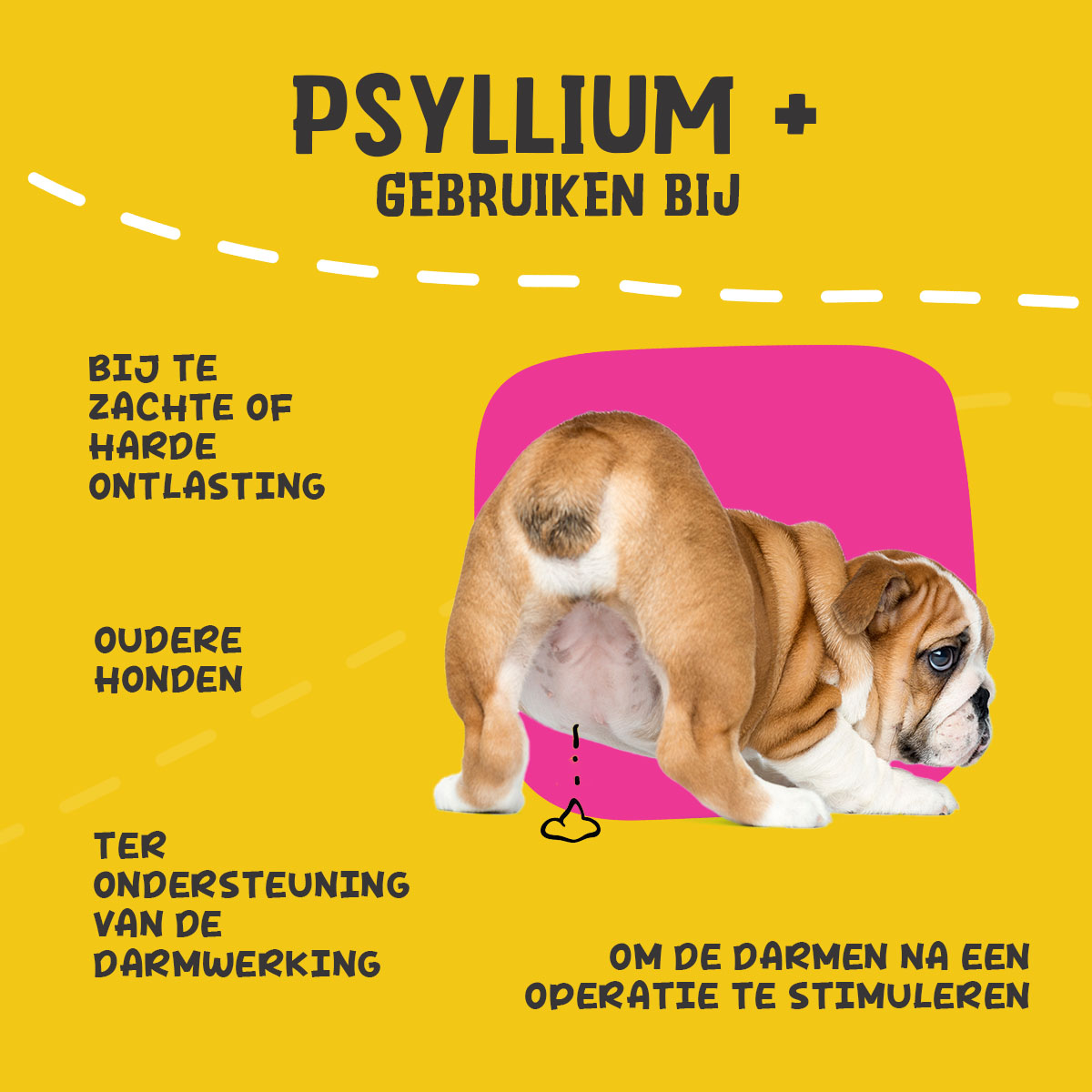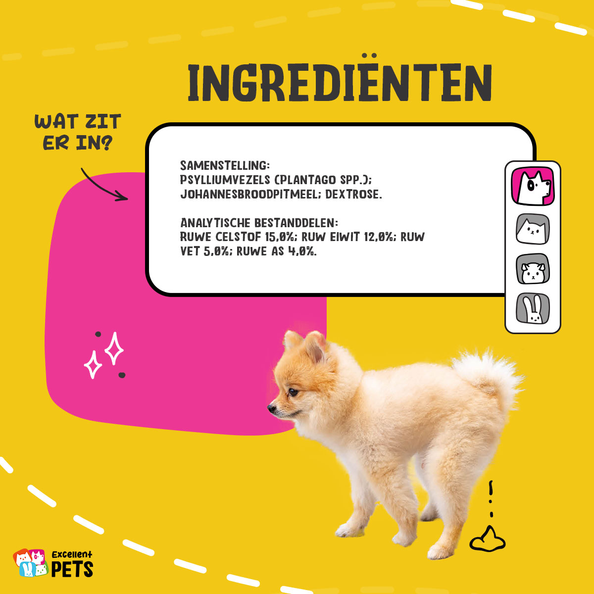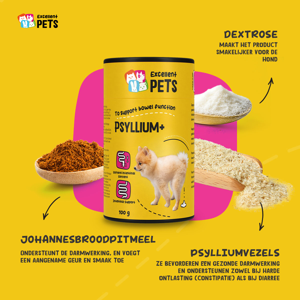 Excellent Pets Dog Psyllium+ bevat onder andere psylliumvezels en johannesbroodpitmeel. Psylliumvezels zijn de zaadschillen van vlozaad, afkomstig van een plant uit de weegbreefamilie. Het helpt de ontlasting zachter te maken en draagt bij aan een goede darmwerking. Johannesbroodpitmeel ondersteunt eveneens de darmwerking en geeft het product een aangename smaak en geur.