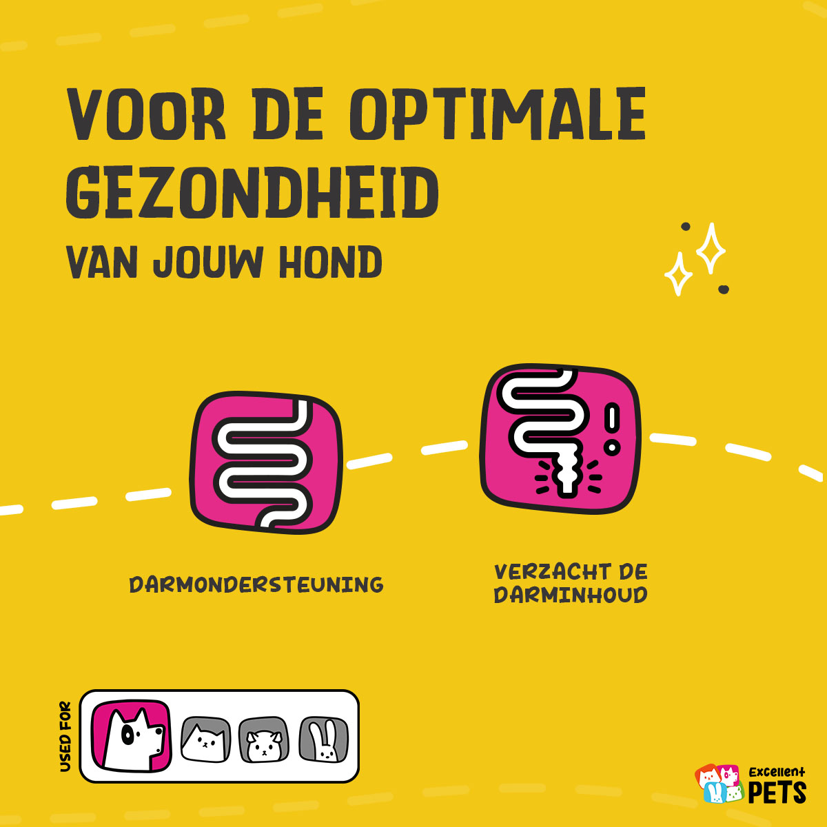 Excellent Pets Dog Psyllium+ is een aanvullend diervoeder voor honden in poedervorm. Het zorgt voor een zachtere darminhoud, bevordert een goede darmwerking en stimuleert de darmen na de operatie.