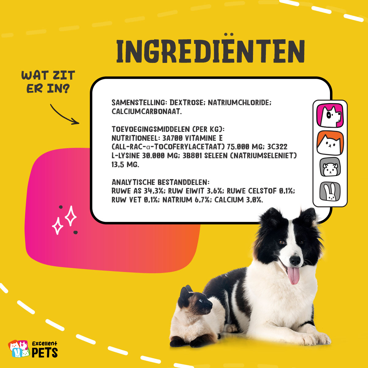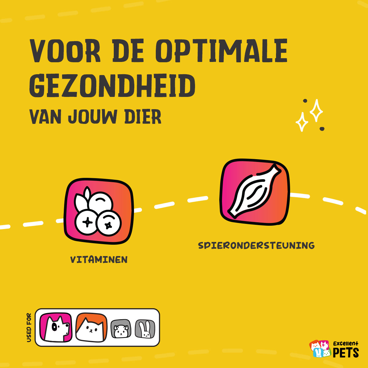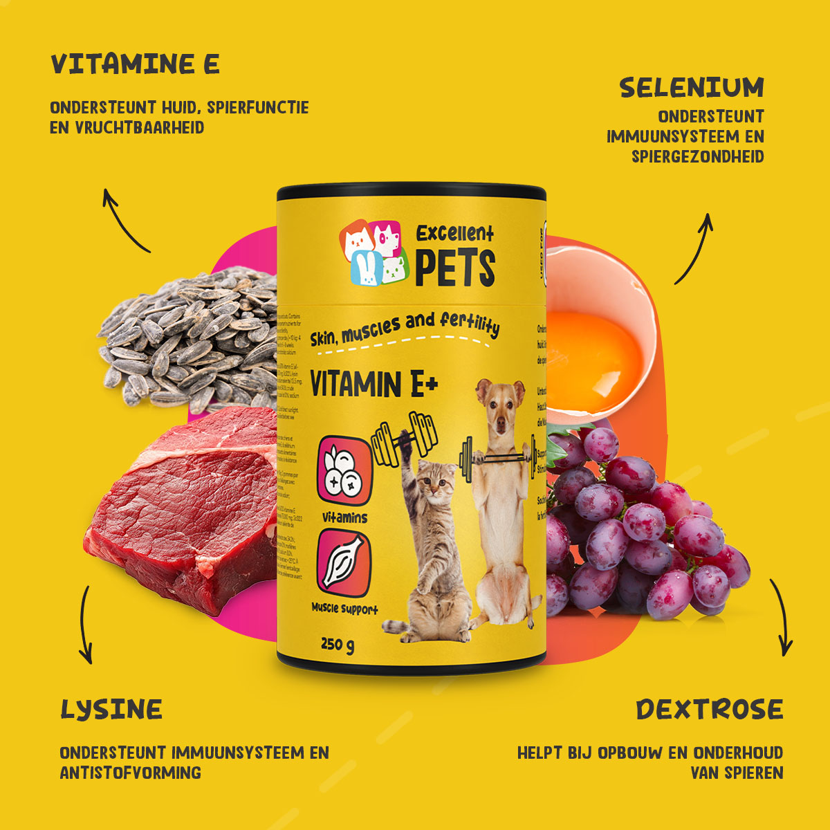 Excellent Pets Vitamin E+ bevat onder andere vitamine E, selenium en lysine. Vitamine E en selenium zijn antioxidanten, die helpen het lichaam te beschermen tegen ouderdomsverschijnselen. Vitamine E draagt daarnaast bij aan het behoud van een gezonde huid en het stimuleert de vruchtbaarheid. De combinatie van vitamine E en selenium ondersteunt de weerstand en spieren. Lysine is een essentieel aminozuur, dat een bouwsteen voor eiwitten is, het immuunsysteem ondersteunt en bijdraagt aan de vorming van afweerstoffen.