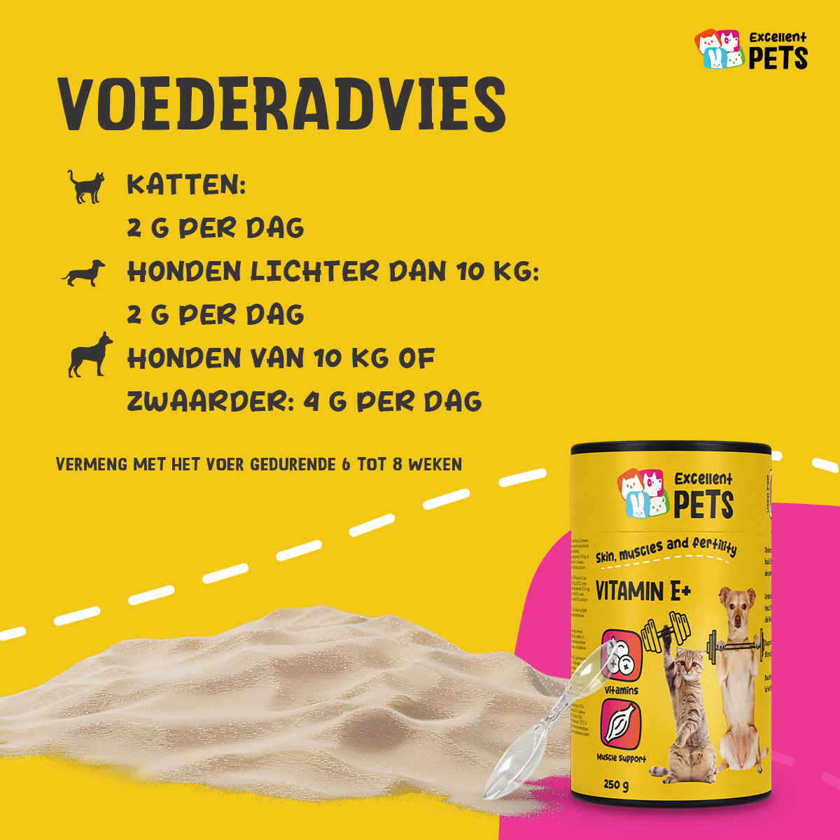 Excellent Pets Vitamin E+ is een aanvullend diervoeder voor honden en katten in poedervorm. Het ondersteunt het herstellend vermogen van de huid, het stimuleert de vruchtbaarheid en het ondersteunt de spieren.