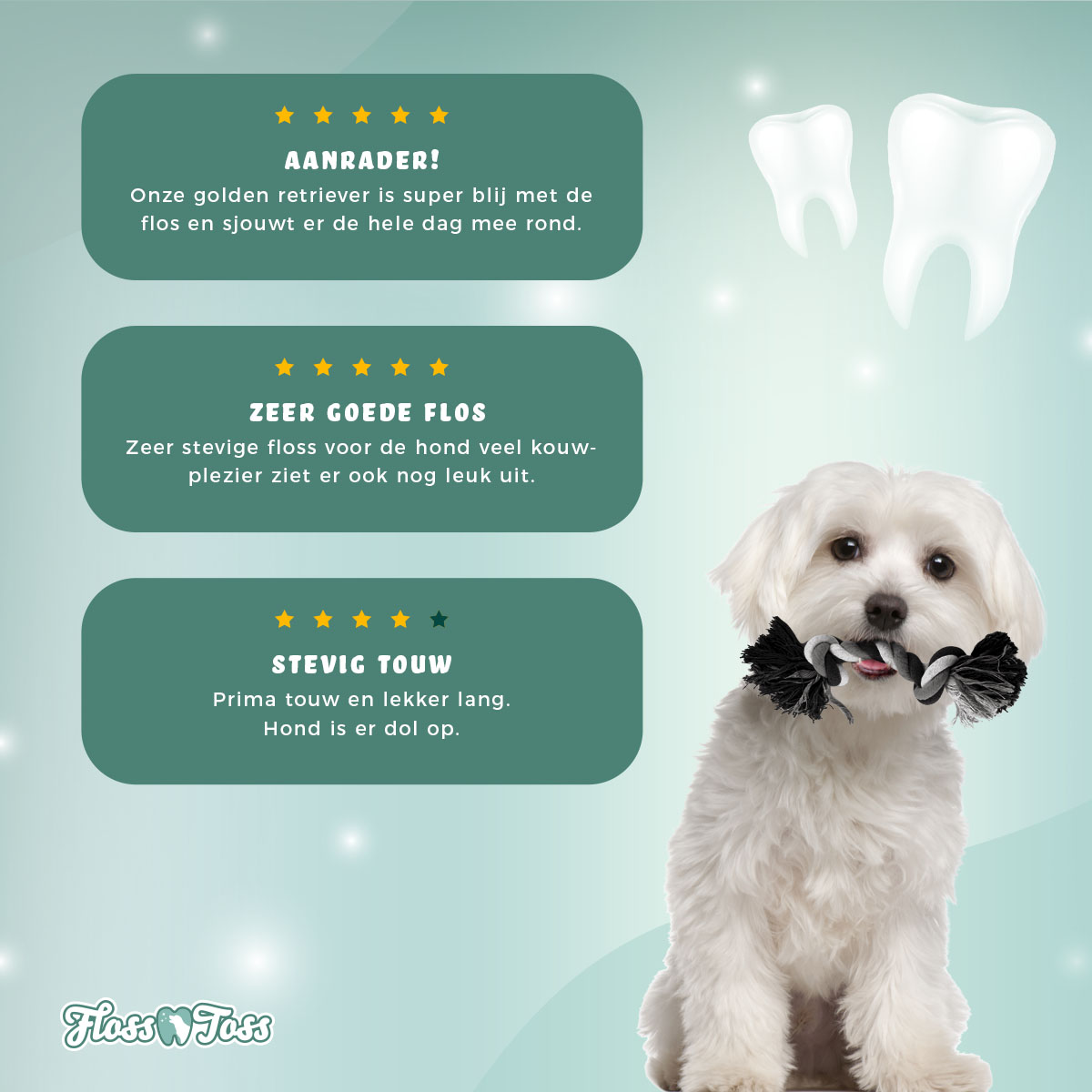 Kortom een het flossen met een flosstouw is onmisbaar voor iedere hond!