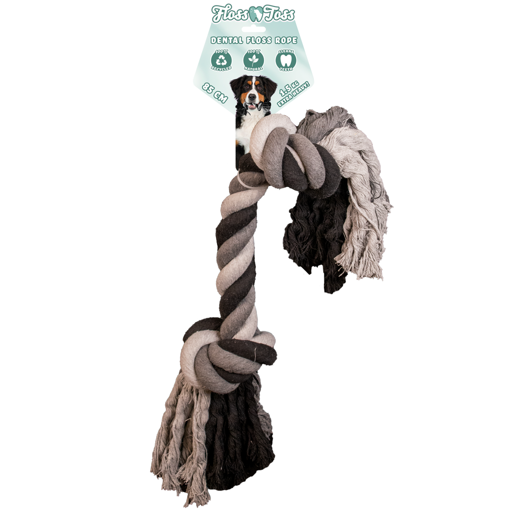 Dit geweldige flostouw van Floss Dental Rope is gemaakt van 100% natuurlijk katoen, waardoor het veilig, duurzaam en milieuvriendelijk is. Het is speciaal ontworpen voor apporteer- en trekspelletjes met honden. Tijdens het spelen helpt het flostouw niet alleen om de gezondheid van de mond van je hond te verbeteren, maar ook om de tanden en tandvlees te reinigen. Dit komt door de speciaal ontworpen vlechtwerktechniek die gebruikt wordt, waarbij alleen hele draden worden gebruikt, waardoor het flostouw strakker gevlochten is en veel sterker dan reguliere flostouwen. Bovendien is het gemaakt van gerecycled materiaal, dus het is niet alleen goed voor je hond, maar ook voor het milieu.