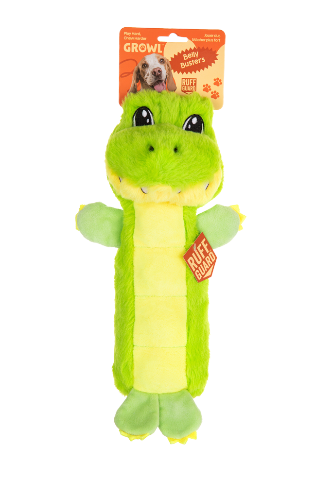 Growl Belly Busters zijn zachte maar stevige pluche hondenspeeltjes met een extern piepvlak en een grote interne pieper, speciaal ontworpen voor interactief spel en knuffelen.
