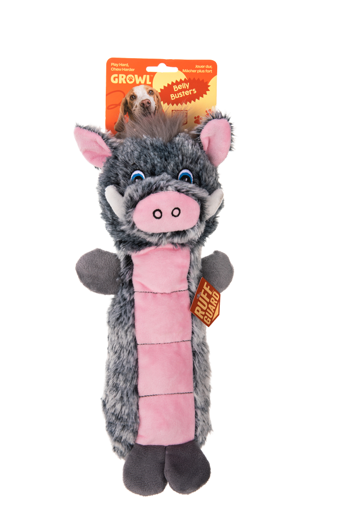 Growl Belly Busters zijn zachte maar stevige pluche hondenspeeltjes met een extern piepvlak en een grote interne pieper, speciaal ontworpen voor interactief spel en knuffelen.