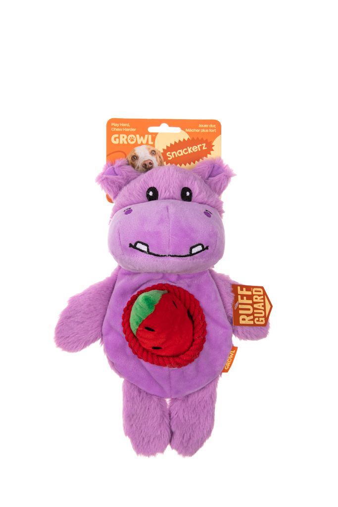 De Growl Snackerz combineren zacht pluche met een verrassend interactief snackspeeltje. Elk Snackerz-speeltje bevat een grote pieper én een verstopt snackspeeltje, zoals een wortel, watermeloen of banaan, met eigen pieper. Dit ontwerp daagt honden uit om te graven, ontdekken en spelen, waardoor het speelse element van het snackspeeltje continu wordt benut.