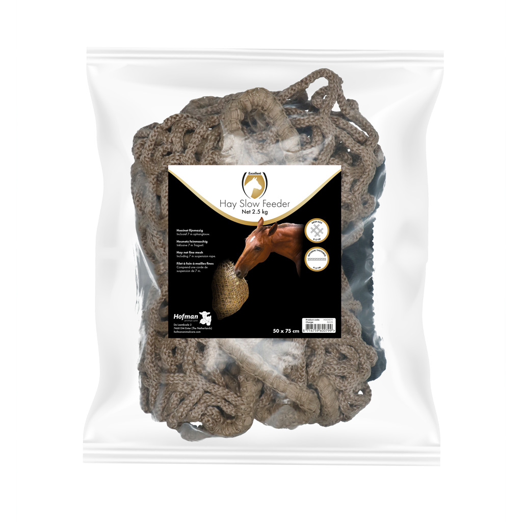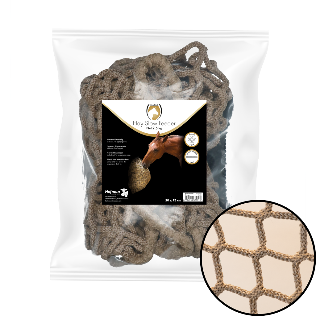 Oersterk fijnmazig hooinet dat ervoor zorgt dat het hooi langzaam opgenomen wordt.