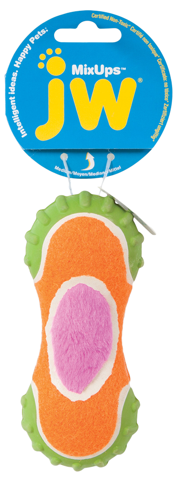 Nu is er een speeltje die al de 3 materialen bevat, hierdoor zijn de JW Mixups praktisch onweerstaanbaar voor iedere hond. Het medium bot is voorzien van een pieper voor extra speelplezier.