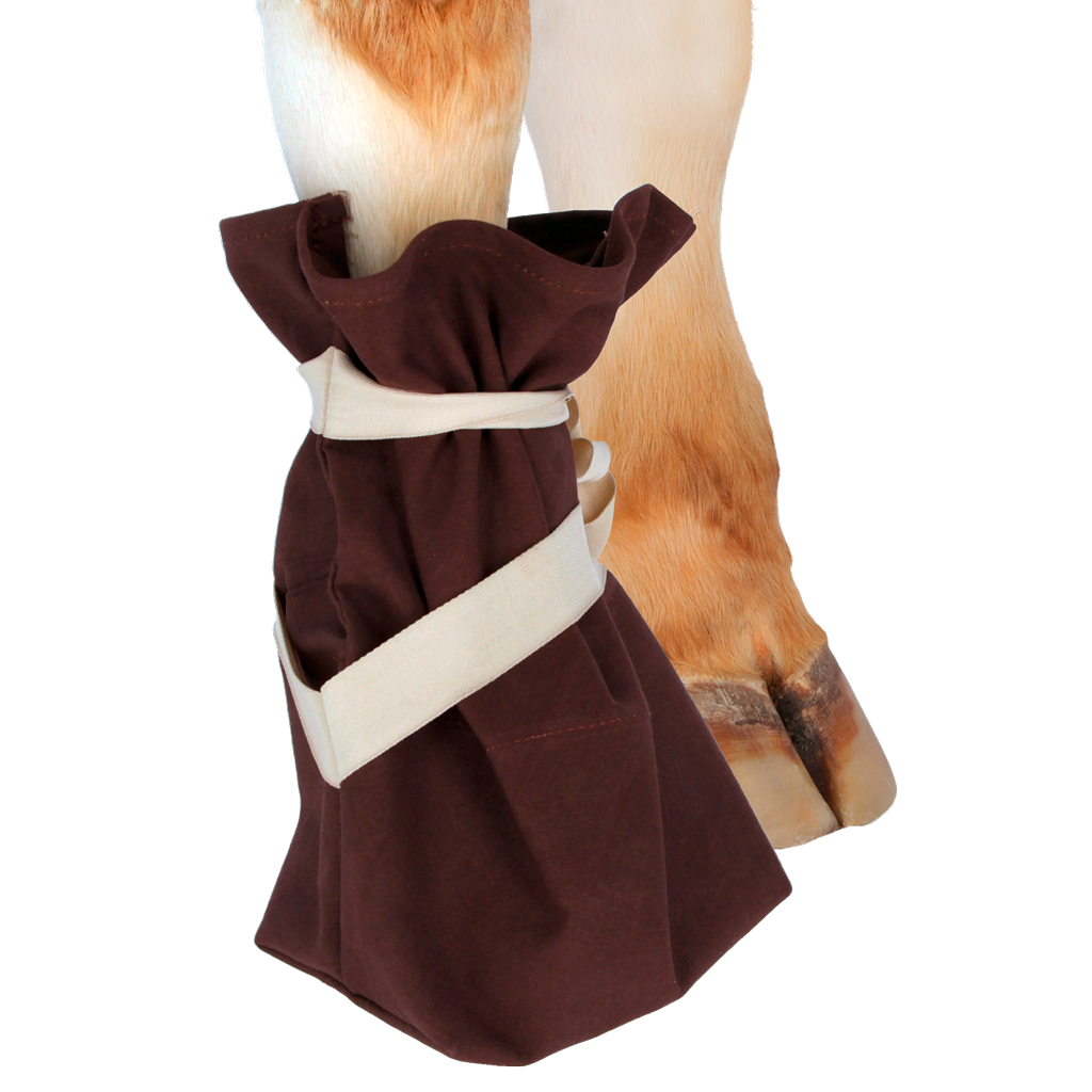 Duurzame en robuuste behandelschoen van canvas met twee banden. Ideaal voor het behandelen van paardenhoeven of runderklauwen met zalven of oplossingen.