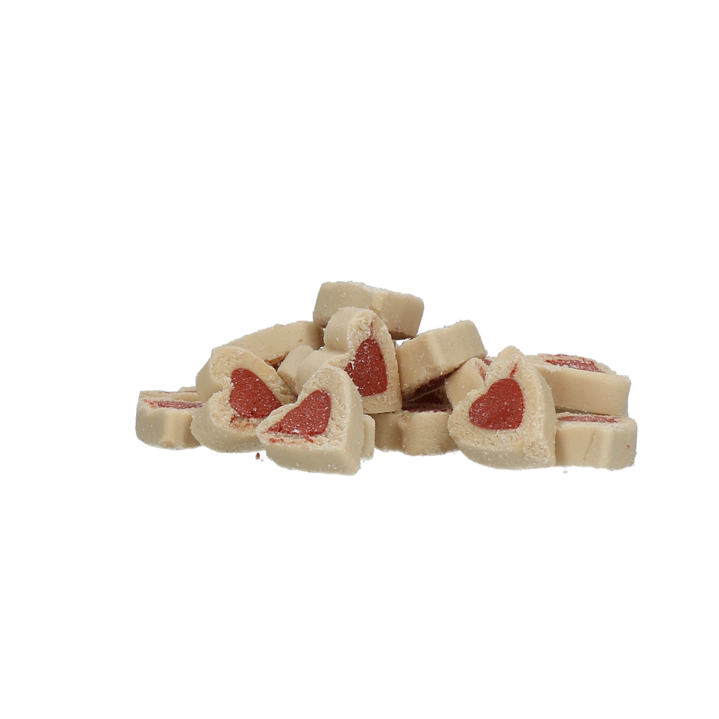 All you need is love ! En van deze surf en turf-snack houdt iedere hond! Deze trainer-snack is gevuld met vlees en zalm en is een semi-moist soft beloning. Dit houdt in dat deze snacks nog licht vochtig zijn en daardoor extreem krachtig zijn in smaak en geur. Daarom zijn dit ook de ideale snacks voor hondentrainers en baasjes om hun honden en pups te belonen bij goed gedrag tijdens een training of cursus. Deze trainer-snack bevat geen toegevoegde suikers en het mooiste van alles is dat deze snoepjes gemaakt zijn in Nederland!