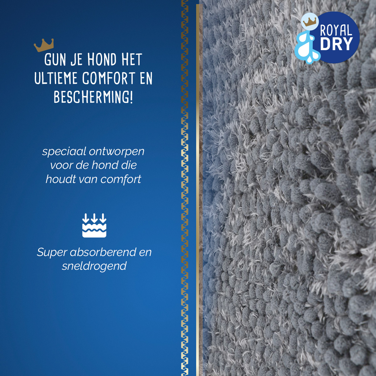 De producten van Royal Dry zijn ontwikkeld om je hond als een koning of koningin te behandelen, nadat ze nat of modderig zijn geworden. Het doel is een blije hond en een schoon huis! De Royal Dry producten zijn gemaakt van microvezel chenille, een heerlijk zacht en pluizig garen. Door de vele lusjes, die gemaakt zijn van miljoenen ultrafijne draden, is het oppervlak vele malen groter dan dat van een gladde stof. Hierdoor kunnen de Royal Dry producten maar liefst 7x hun eigen gewicht in vocht opnemen en vasthouden! Perfect om te gebruiken na een bos- of strandwandeling, na het wassen of gewoon op een regenachtige dag. Of je nu je hond droog wil maken, warm wil houden of je huis of auto schoon wil houden, bij Royal Dry vind je het juiste product!