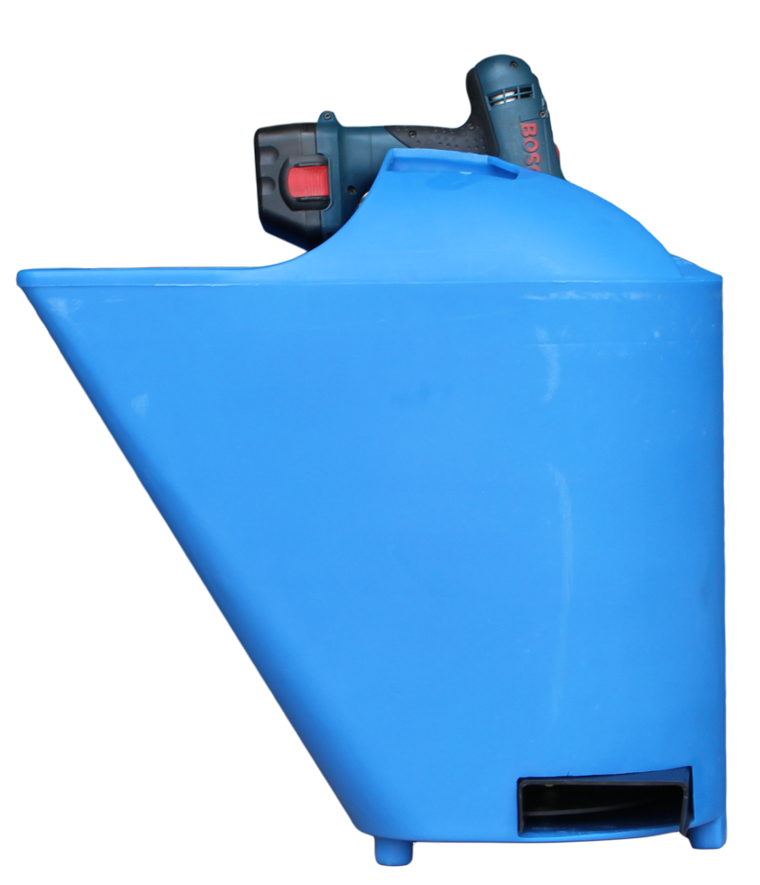 De zaagselstrooier kent een inhoud van 12 liter en is eenvoudig te bedienen met bijna iedere accuboormachine.
